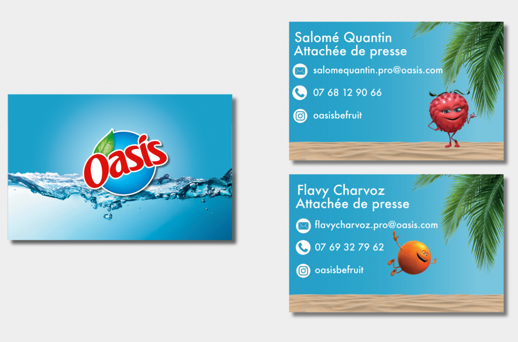 Fournie pour permettre aux journalistes de nous recontacter facilement pour toute information supplémentaire. Nous avons sélectionné la mascotte Oasis qui nous correspondait le mieux, afin de créer un lien plus chaleureux avec les destinataires et de rendre les cartes plus humaines.