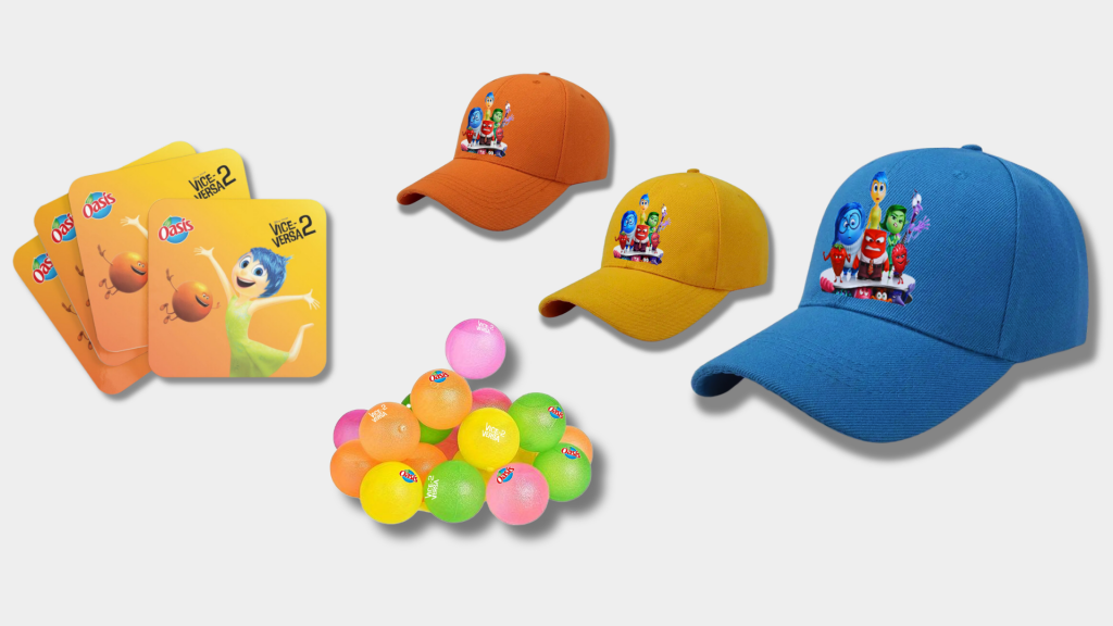 Dans le cadre du lancement de nouvelles boissons, nous avons réalisé un kit de presse pour promouvoir les produits en collaboration avec le film d’animation Vice-Versa 2. L’objectif était de profiter de la sortie du film en faisant un parallèle entre les mascottes d’Oasis et les émotions de Riley, les personnages principaux du film. Cette approche visait à attirer l’attention sur le produit tout en offrant une dimension ludique et originale à la campagne.